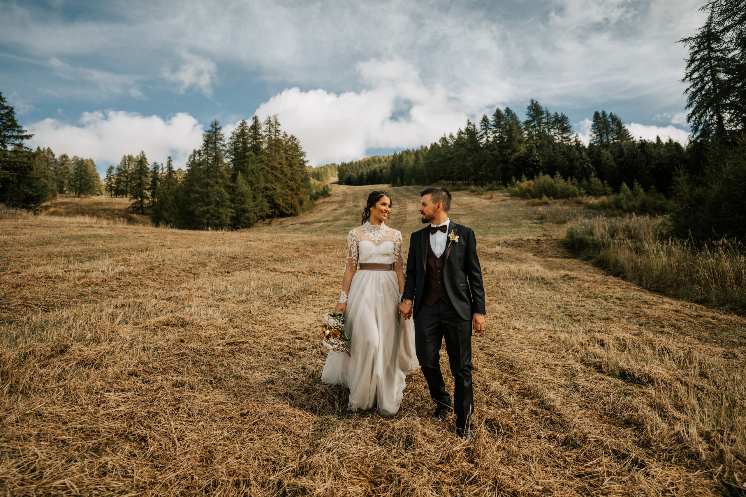 Dopo la cerimonia, gli sposi hanno scelto di vivere un momento di intimità per le foto di coppia nei boschi che circondano la celebre località sciistica di San Sicario. Le luci soffuse di ottobre e i riflessi dorati del fogliame hanno creato un’atmosfera magica, rendendo ogni scatto un piccolo capolavoro. I sorrisi di Sara e Davide, illuminati dalla gioia e dalla complicità, hanno reso questo momento indimenticabile.